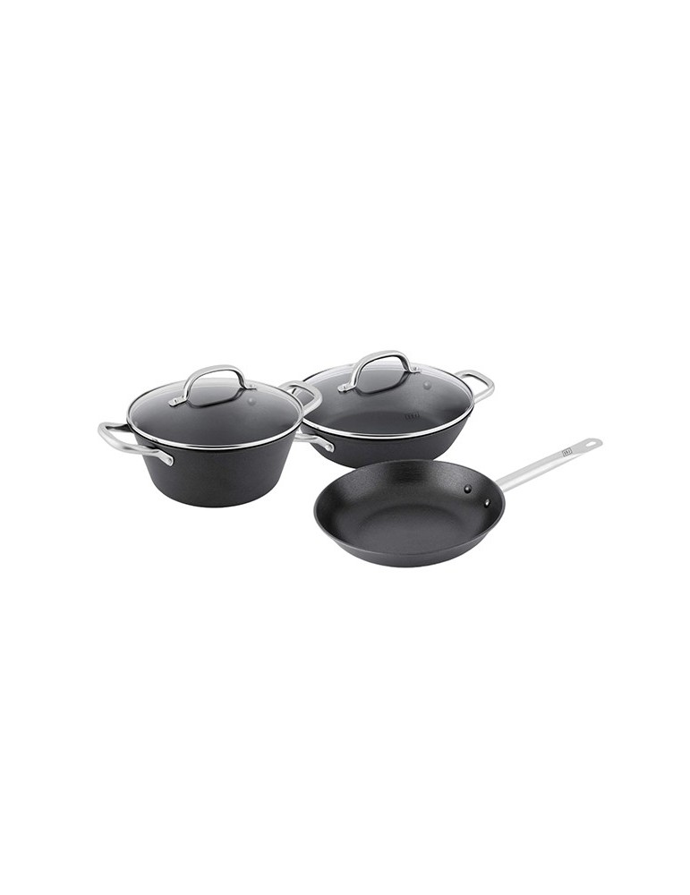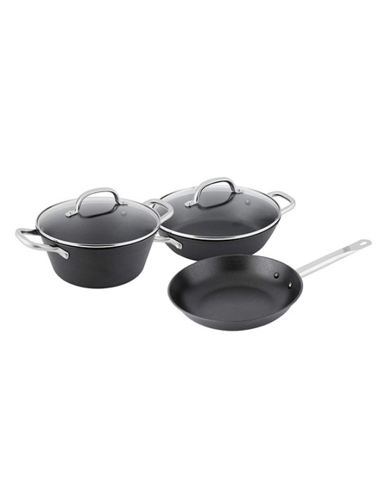 Compuesto por : Olla Holandesa con tapa de vidrio de 24 x 11 cm - 1 Cacerola con tapa de vidrio de 26 x 7 cm - 1 Sartén de 24 x 4,5 cm. Fabricada en hierro fundido ligero, recubrimiento interior antiadherente de fabricación suiza, llamado ILAG. Apta para todo tipo de cocinas.
