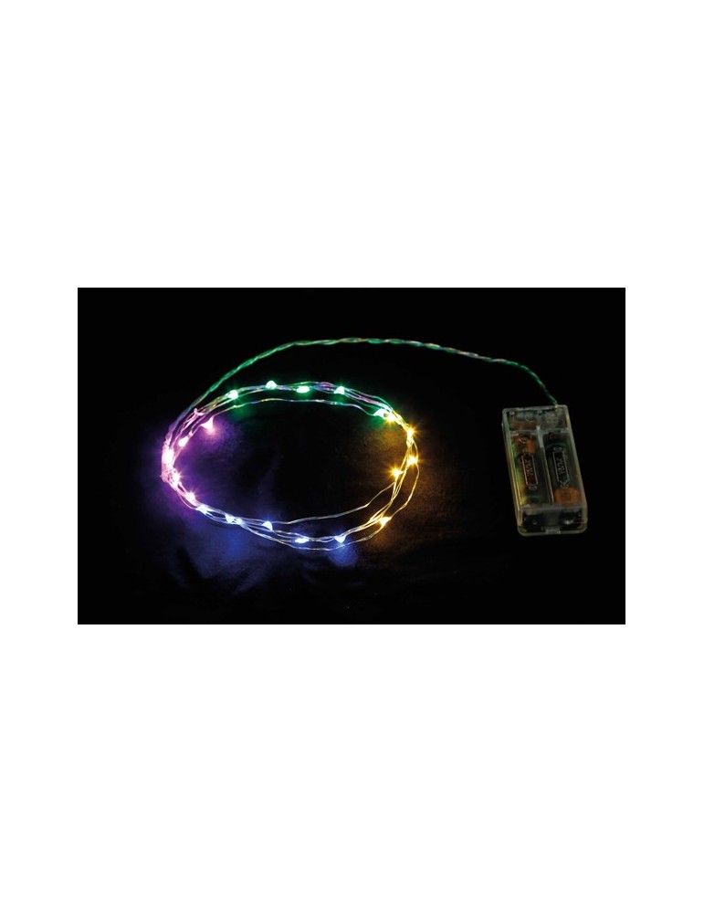 1 m. 10 leds. Funciona a pilas (no incluidas). Colores: blanco cálido, azul, multicolor.