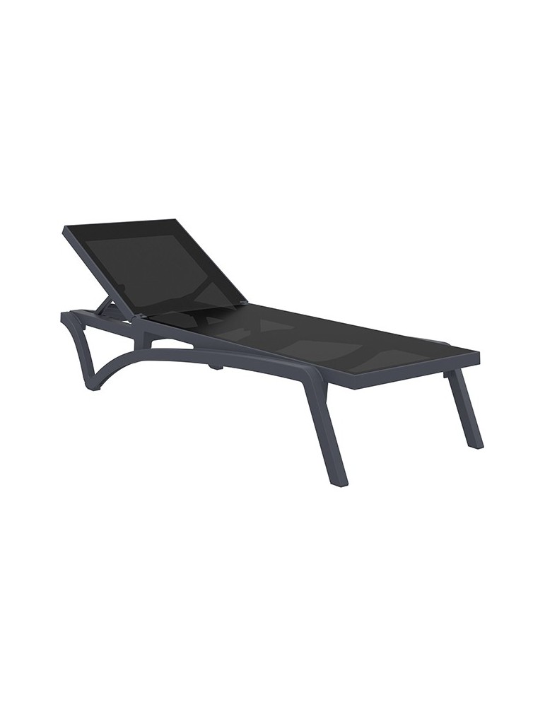 Con estructura en resina reforzada con fibra de vidrio y textilene 500 gr/m2, termo-soldado para mayor resistencia. Apilable, reclinable en 5 posiciones, con tacos antideslizantes y ruedas pequeñas.