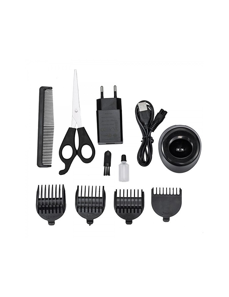 Sin cables, funciona con batería recargable. Autonomía:45 min. Peines de distintas longitudes:3mm, 6mm, 9mm, 12mm.