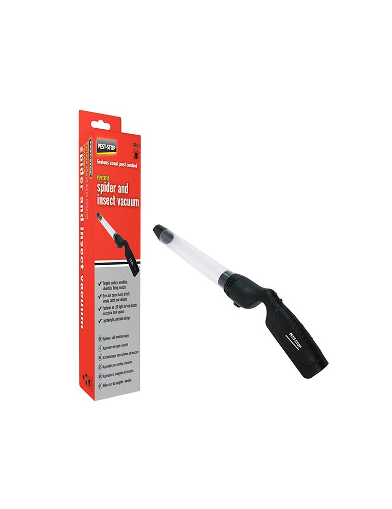 Aspirador para capturar arañas e insectos sin acercarse a ellos. No causa daño ni mata, solo libera las plagas fuera de la vivienda. Incluye una luz LED para encontrar a los insectos en la oscuridad fácilmente. Diseño portátil y ligero. Funciona con pila de 9 V
