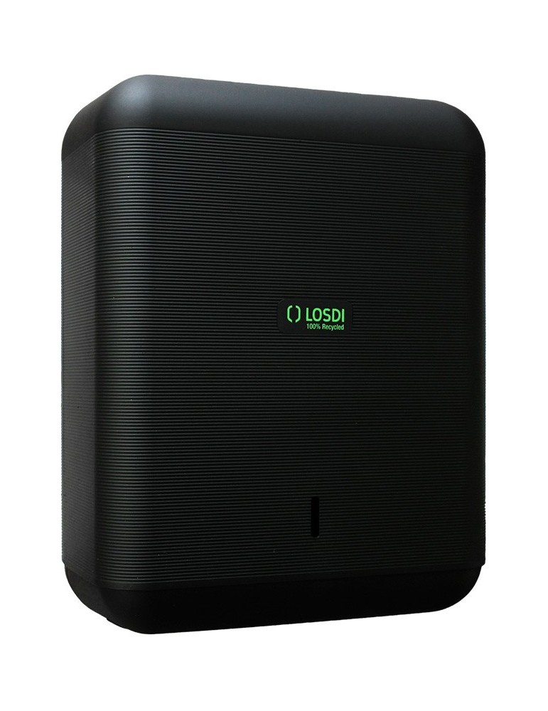 Fabricado en plástico 100% reciclado combinado con un diseño único y llamativo. Tiene capacidad para 600 toallas interplegadas en Z, V y W con un ancho máximo de 240 mm.