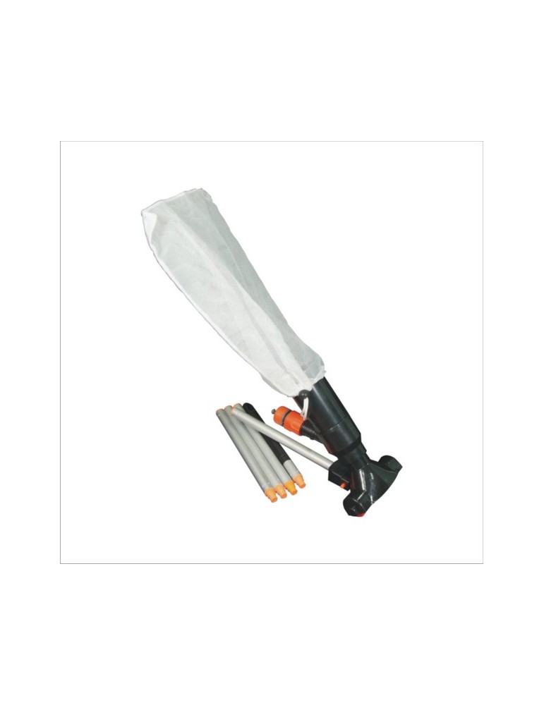 120 cm. En 5 secciones de aluminio. El efecto venturi se crea mediante la conexión a una manguera de jardín. Incluye bolsa de residuos. Para spas o piscinas pequeñas sin sistema de filtración.
