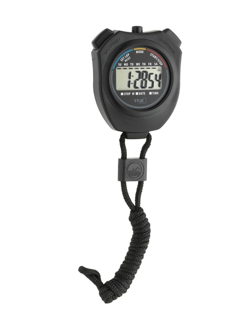 23 horas 59 min. 59 seg. Divisiones 1/100 seg. Tiempo acumulado (Split). Reloj y calendario. Alarma con función snooze. Incluye cordón para colgar. Alimentación 1 pila LR44.