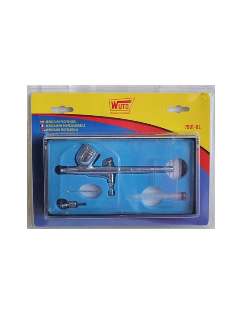 Cuerpo metálico. Permite la regulación del paso del aire y pintura con un solo accionamiento. Incorpora aguja de 0,3 mm y depósito para pintura de 7 cc.