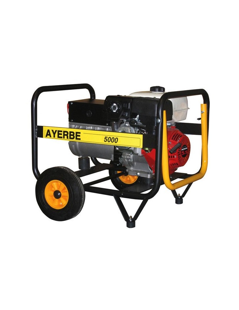 Tensión 230 V / 50 Hz. Válvulas en cabeza. Chasis fijo reforzado con ruedas. Seguridad de aceite. Arranque manual. 9 Hp. Potencia máx. 5 kVA. 4.200 W. Depósito 6 l. Consumo 1,8 l/h.
