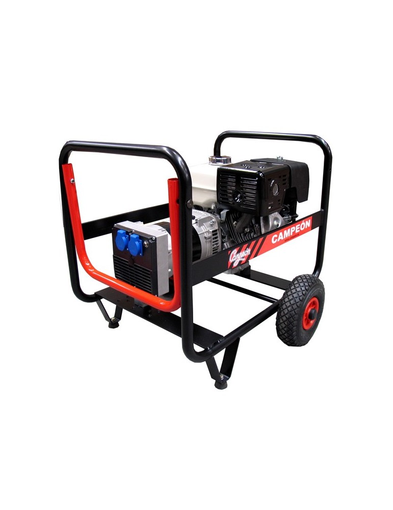 Chasis reforzado con ruedas neumáticas. Arranque reversible, Motor HONDA GX-270 9 HP/3.600 rpm. Alternador 4,2 kVA-Tensión 50 Hz/230 V. Potencia máxima 5,0 kVA FP0,8 - Potencia nominal 4,5 kVA FP0,8. 2 tomas VDE. Protector térmico.