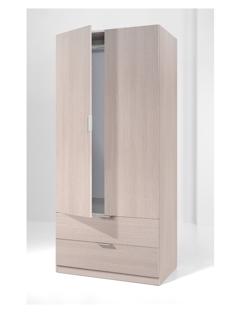 Medidas 180 x 81 x 52 cm. Melamina en color roble de 15 mm. 2 puertas y 2 cajones con tirador de aluminio en L. 1 barra de colgar de aluminio.