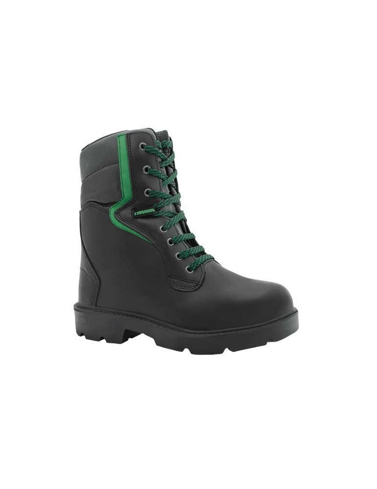 Bota de Seguridad de caña alata certificada S3 según EN ISO 20345. Destaca por estar certificada para la protección contra cortes provocados por sierras de cadenas. Piel flor natural de 1ª calidad, extra gruesa, muy resistente y con tratamiento hidrófugo. Puntera anti-impactos en acero (200J) y planta textil antiperforación (1100N). Suela diseñada para terrenos abruptos y resistente a altas temperaturas (300ºC). Tallas 39 - 46. T.39
