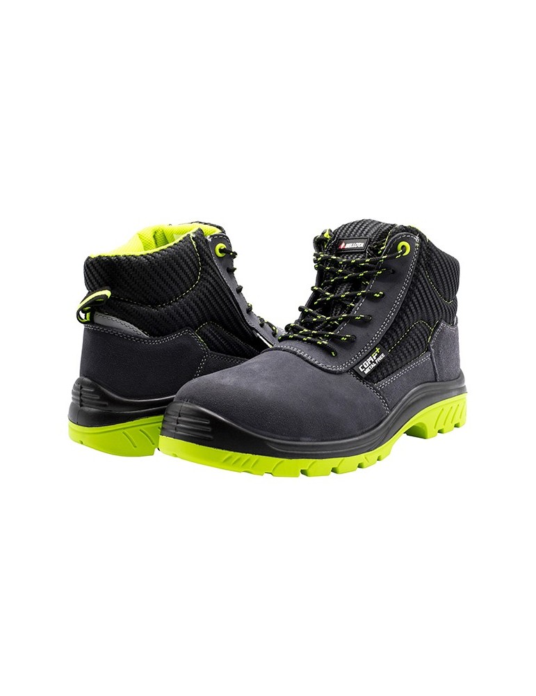 Bota de seguridad Comp+ S1P, con plantilla antiperforación textil y puntera de composite, en serraje gris transpirable, con suela y detalles en verde y elementos reflectantes en el talón. De horma ancha, resulta cómod, ligero y flexible. Para almacenaje, transporte, industria y construcción.