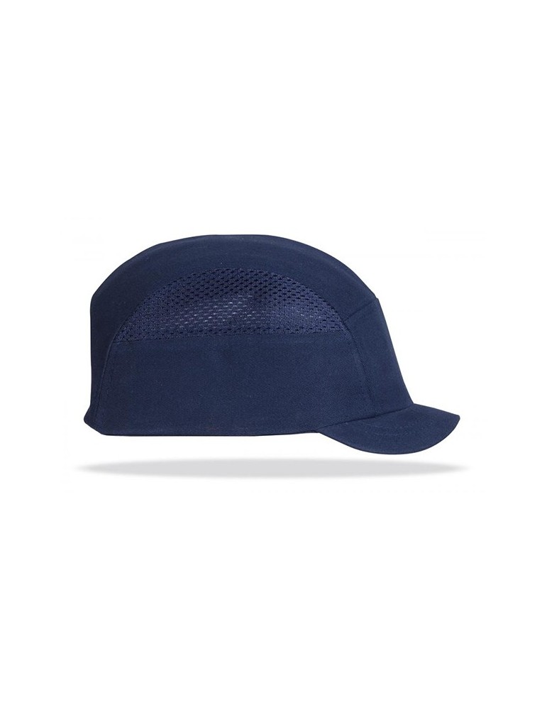 Gorra de protección antigolpes. 100% algodón. Casquete interior en ABS (plástico muy resistente al impacto y con gran capacidad de absorción de energía incluso a bajas temperaturas) con almohadilla. Ventilación lateral. Talla única regulable mediante velcro (de 54 a 59 cm). Color azul marino.