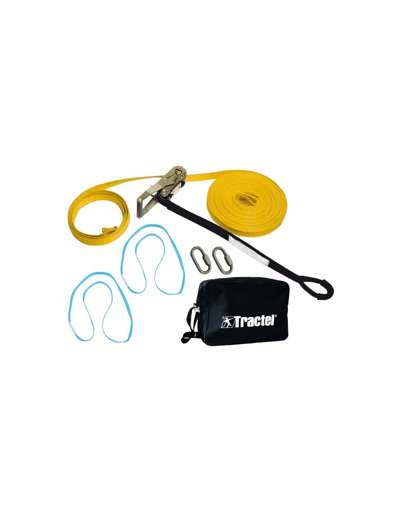De cinta para dos personas con un peso de 150 kg. Longitud máxima 20 m. Incluye 2 conectores MR9, 2 cintas de anclaje AS30S y bolsa bandolera. Norma EN 795-B: 2012.
