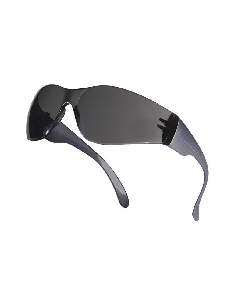 Patillas tipo espátula planas y flexibles. Puente nasal policarbonato integrado. Fácil uso con casco de obra y cascos anti-ruido. Protecciones laterales. Peso: 25 g. Oscuras.