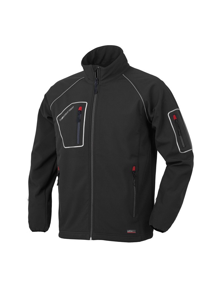 Chaqueta en Softshell con 4 bolsillos en tejido particularmente suave y al mismo tiempo técnico. Dotado de inserciones reflectantes y con un práctico roller porta-llaves. Composición: Softshell (poliéster/spandex) con membrana TPU 8000 mm/1000 MVP. Colores negro o rojo. Tallas M - XXL.