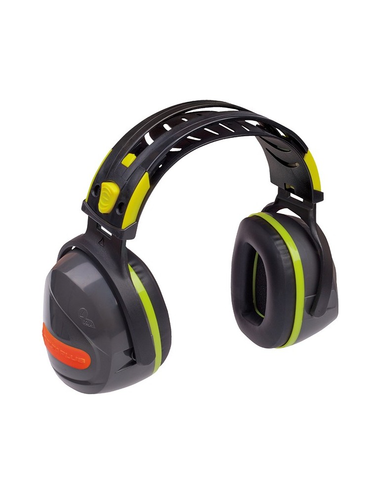 Casco antiruido-SNR 33 dB. Con orejeras ABS. Almohadillas rellenas con espuma sintética. Doble arnés de plástico (POM), ajustable en altura, con inserción metálica y refuerzo suave y aireado para un mejor confort. Color gris o amarillo. Sin visera para una mejor visión.