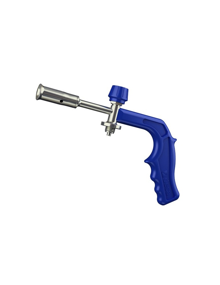 Soldador con adaptación directa a botella de 0,5 kg. Boquilla Ø17 mm. Regulación o cierre con pomo en el cuerpo central. Mango ergonómico tipo pistola.