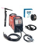 Multifunción, electrodo, hilo gas / no-gas y TIG. 150 amperios. Para hilo de 0,6 y 0,8mm y hasta 1mm en no gas. Se suministra con pinza de masa, antorcha hilo, pinza portaelectrodo, bobina hilo tubular y antorcha TIG. Peso: 7,7 kg.