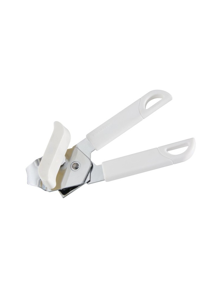 18 cm. Excelente accesorio ya que posee una llave que con tan solo ir girando la manivela, la lata se abre rápidamente y sin esfuerzo, práctico y fácil de usar, color blanco e inox. Colgable.