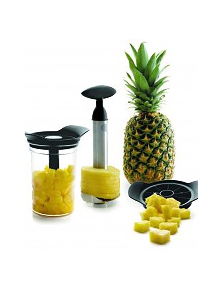 Juego de pelador y cortador de piña. Contiene un recipiente y tapa para almacenar la piña pelada.Fabricado en acero inox.