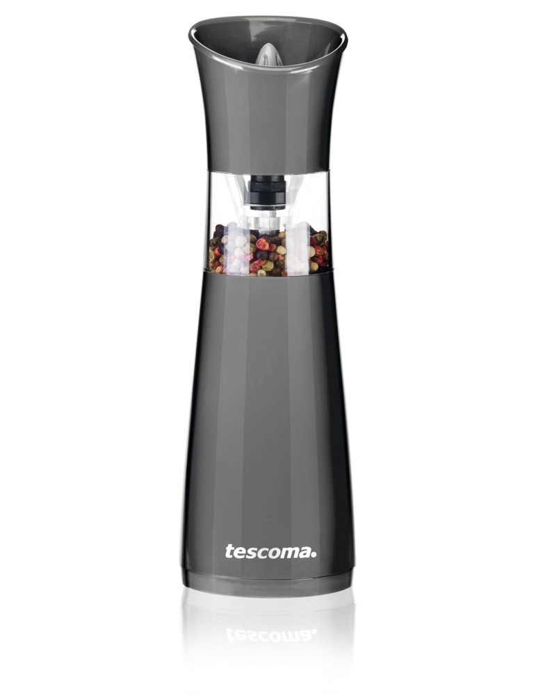 Mecanismo de molienda cerámico con tamaño de grano ajustable y un motor potente. Fabricado de resistente plástico, cargado con 6 pilas AAA 1.5 V (pilas no incluidas). Para pimienta o para sal.