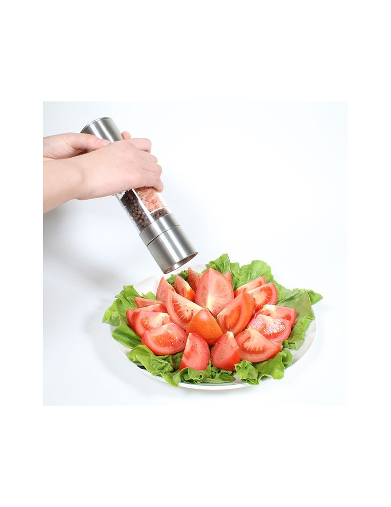 ¡Sazone sus comidas en la mesa con facilidad! Este molinillo permite cargar sal y pimienta en el mismo utensilio gracias a su doble compartimento, ahorrando espacio y ganando comodidad. Medidas: d.5,2 cm