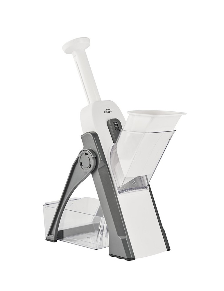 Corte por accionamiento vertical con una palanca de retroceso automático. Procesado de alimentos 5 veces más rápido que en el trabajo manual. SEGURO: protector contra cortes, no hay contacto directo con las manos durante su uso. Dispone de un contenedor de alimentos. Palanca con bloqueo de seguridad