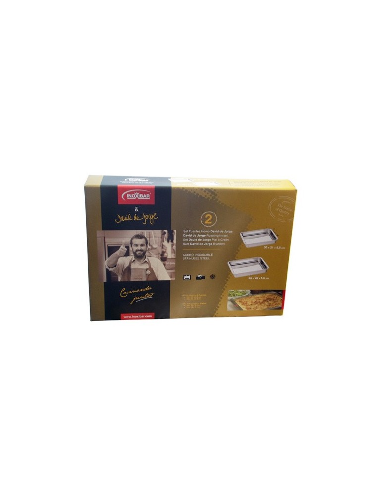 Set de 2 fuentes de horno rectangulares en acero inoxidable 18%, de 30 x 21 x 5,5 y 35 x 26 x 5,5 cm, en caja de regalo con la imagen de David de Jorge.
