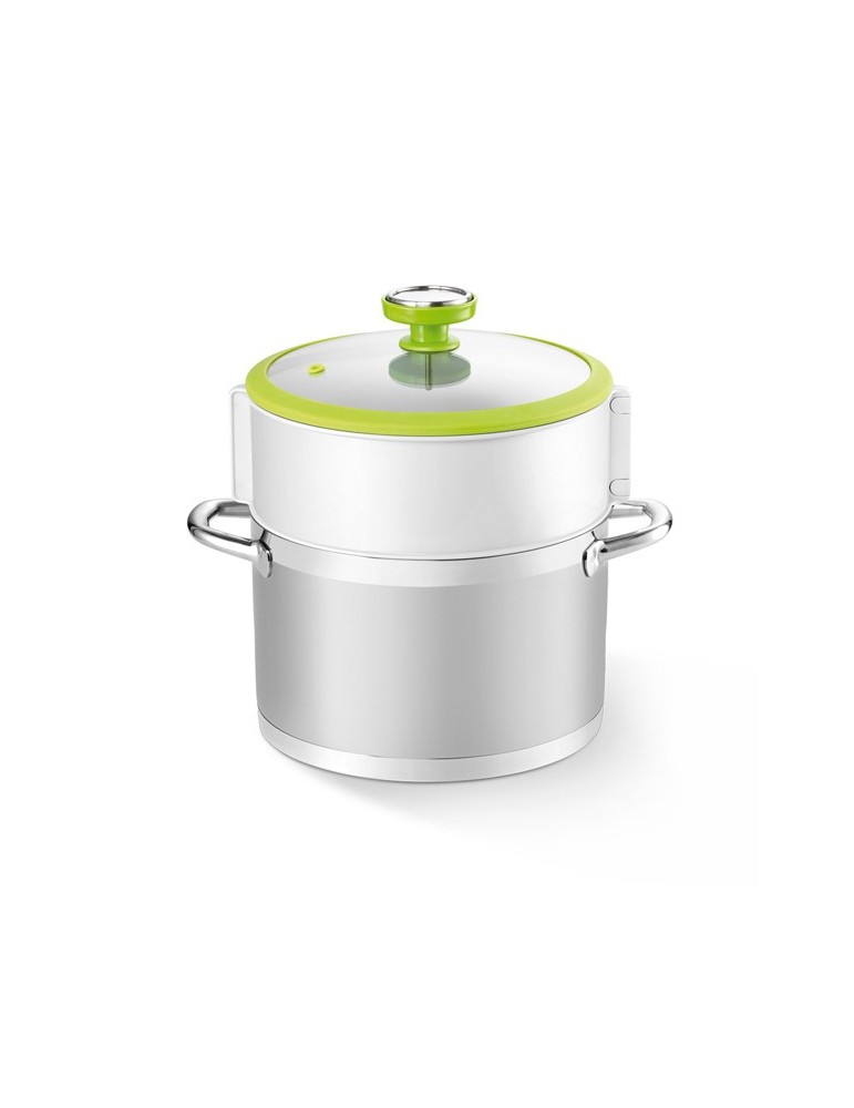 Para conservar y esterilizar fácilmente alimentos al vapor. Diámetro 24 cm. La tapa de vidrio tiene un termómetro preciso para comprobar fácilmente la temperatura. La base de vapor protege los frascos de la alta temperatura en el fondo del recipiente.