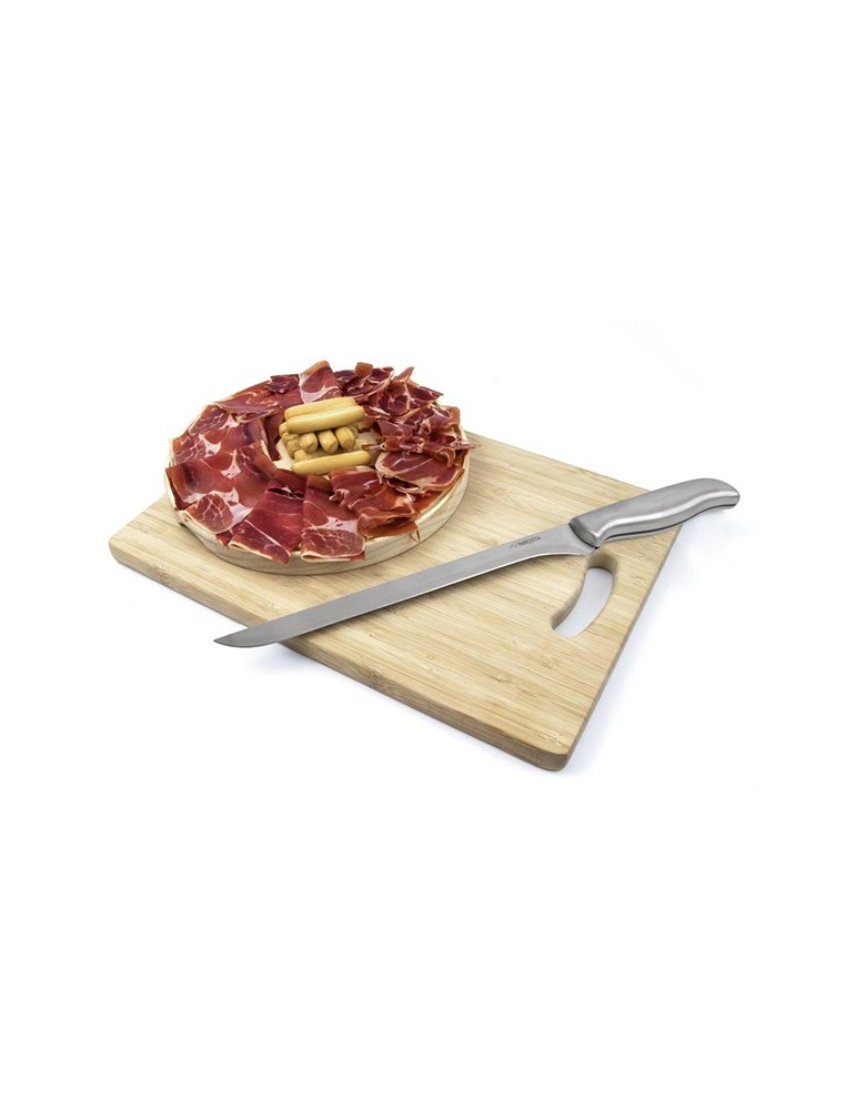 El cuchillo provisto de una hoja larga, flexible y afilada, deslizará fácilmente y sin esfuerzo por la superficie del jamón.La hoja de acero inoxidable 3CR14 con espesor de 2,00mm. mantiene un filo duradero y resiste a la corrosión. Largo de la hoja: 23cm.