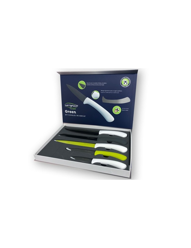 Acero inoxidable. Mango de tacto suave y fi lo duradero con revesti miento anti adherente. Anti bacteriano. Tabla de cortar de regalo: fabricada en HDPE PE500, tacos anti deslizantes, medidas: 300 x 200 x 20 mm. Colores surti dos.