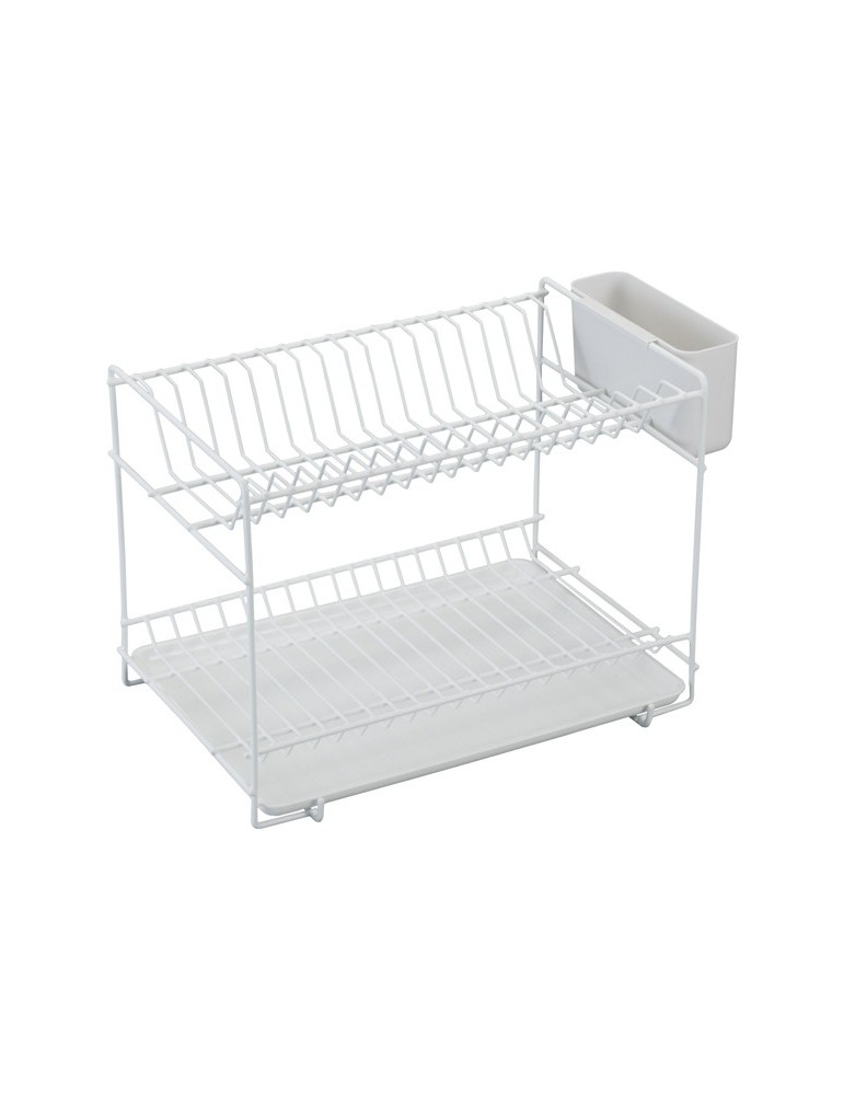 Escurreplatos en dos niveles, con capacidad para 18 platos. Fabricado en acero con recubrimiento plástico anticorrosivo de color blanco. Con bandeja para el agua en plástico de color blanco, muy práctica si desea utilizar el escurreplatos encima de un mueble.