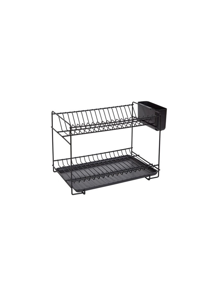 Escurreplatos en dos niveles, con capacidad para 18 platos. Fabricado en acero con recubrimiento plástico anticorrosivo de color negro (resina). Esta cobertura ofrece una protección duradera frente la corrosión, los golpes y rasguños, inclemencias del tiempo y demás agentes contaminantes.