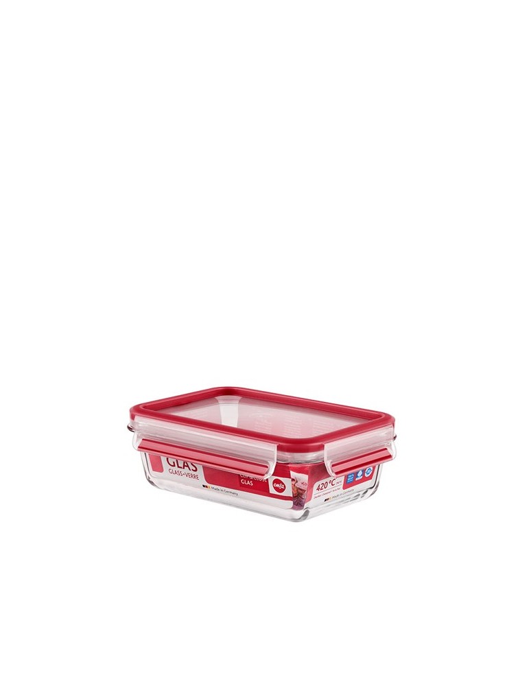 Cristal de borosilicato, diamantado. Sistema de cierre de un solo clic. Apto para cocinar en microondas y horno hasta 420 º. Válido para lavavajillas y frigorífico. Rectangular 0,5 l.