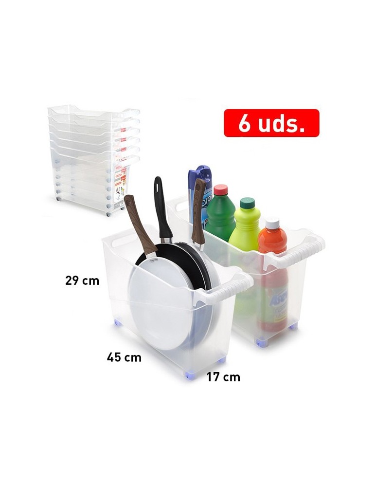 Con ruedas y asas. Su forma alargada te ayuda a alcanzar de forma fácil y cómoda los objetos almacenados en el fondo de los armarios. 45 x 17 x 29 cm.
