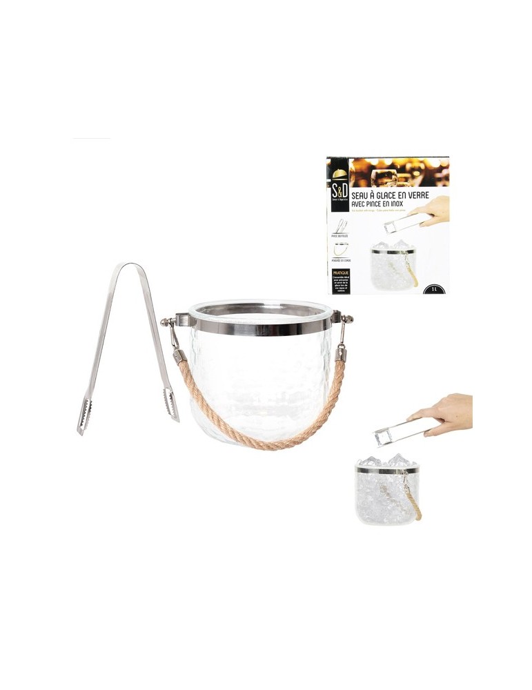 Cubitera transparente 1 l con asa de cuerda y pinzas para hielo dentadas de acero inoxidable. Medidas: 16,5 x 13,3 cm, h. 11,8 cm.
