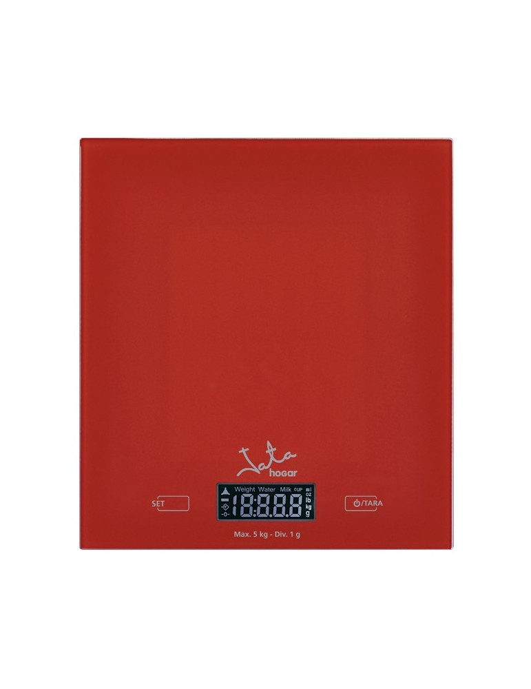 Medición 5 kg / 1 g. Informa: Peso. Volumen agua. Volumen leche. Pulsadores táctiles. Función de tara. Base de cristal de seguridad ?temperit?. Visor ?LCD? autoluminiscente. 4 dígitos. Función de conversión. Pilas no incluidas. Roja o Verde.