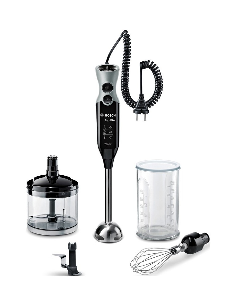 Potencia 750 W. Regulador electrónico de velocidad. Accesorios: picador universal con tapa, cuchilla especial para picar hielo, varilla batidora de acero inoxidable y vaso de mezclas con tapa.