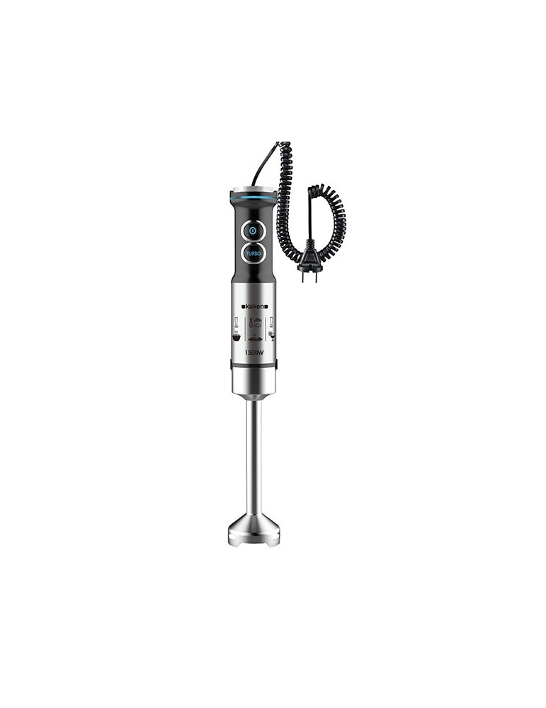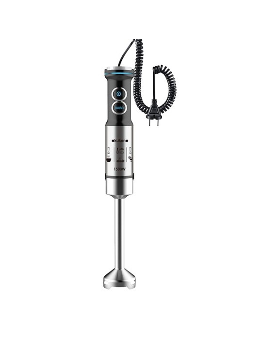 1500 w de potencia. Cuerpo, brazo y cuchillas de acero inoxidable. Mango ergonómico con dos botones de uso. 2 velocidades: Velocidad 1 regulable / Velocidad 2 Turbo. Brazo desmontable para una óptima limpieza. Vaso medidor de 800 ml, varilla de montar y accesorio de picar incluidos