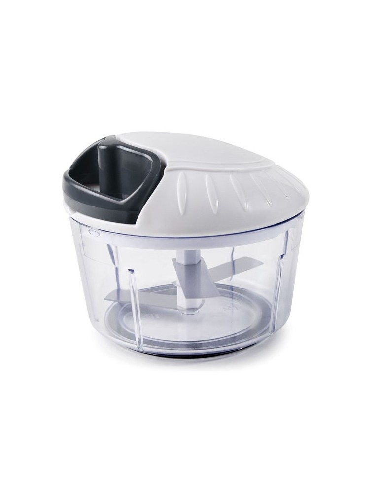 Pica todo tipo de alimentos. Tres cuchillas potentes y afiladas ultra. resistentes de acero inoxidable. Fácil y cómodo uso gracias a su sistema manual. Base antideslizante. Material libre de BPA.
