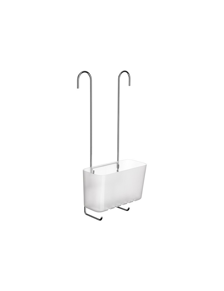 Fabricado con acero Cr. y polímeros plásticos,1 cestillo 200 x 95 x 110 mm, 2 ganchos porta objetos, sin tornillos, garantía 2 años.