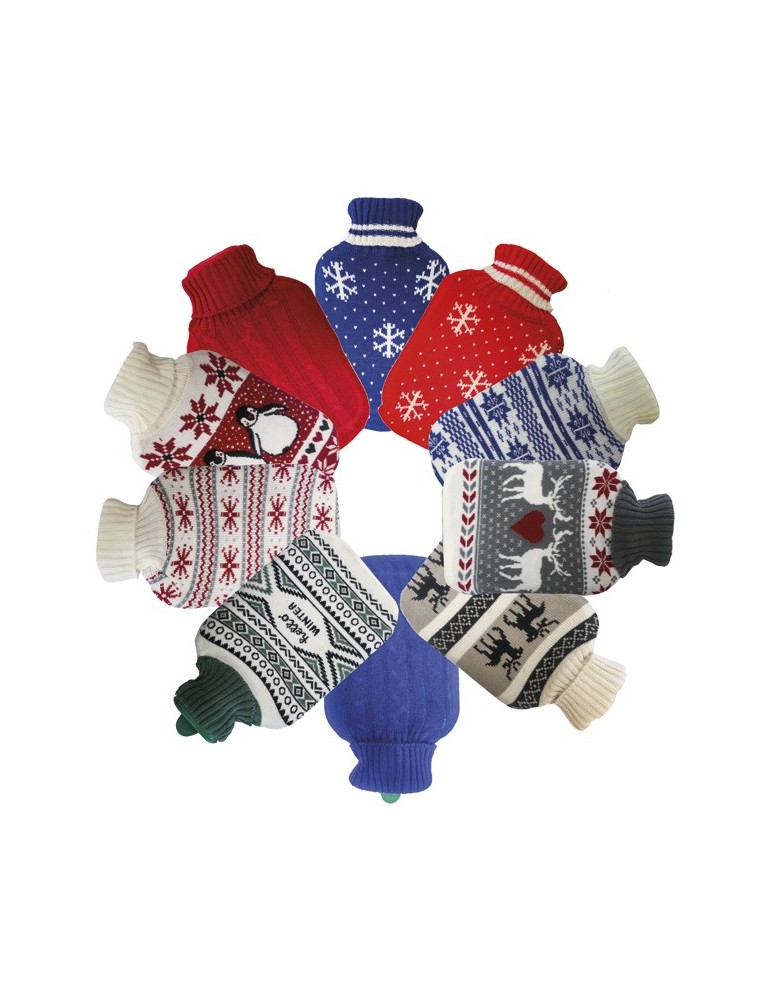 De caucho natural 100%. Con cierre hermético y recubierto Suavidad al tacto. Calor natural y confortable. Capacidad: 2 litros. Diseños surtidos. Con funda EN TEJIDO DE LANA.