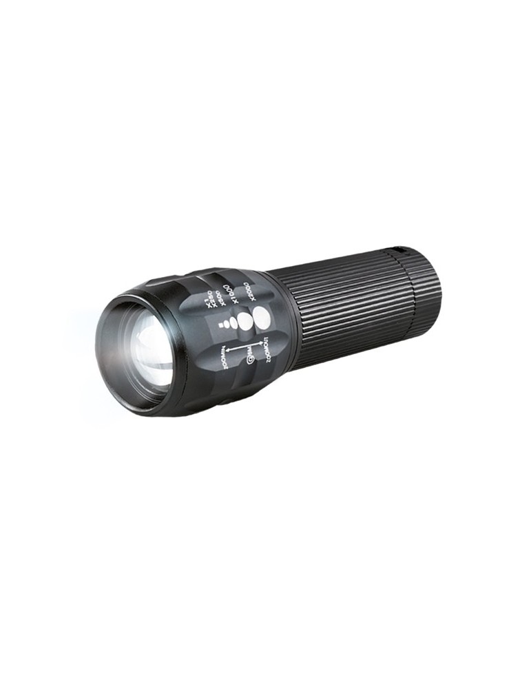 De 1 led de alta luminosidad. Zoom extensible regulable. Diseño práctico y compacto. Fabricada en aluminio de alta resistencia, color negro. Con cordón sujeción muñeca. Resistente a la lluvia. 3 pilas AAA incluidas.