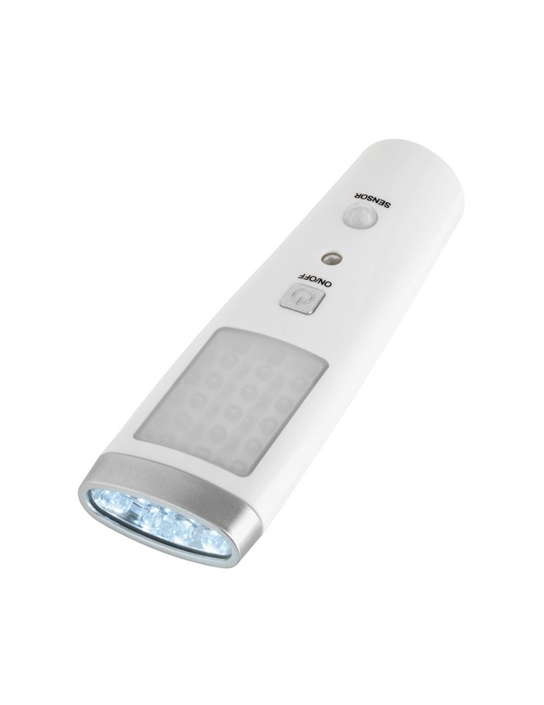 Carga a la base del enchufe. Funciona como linterna (5 LEDs). También autorrecargable mediante agitación. Punto de luz de noche con 15 LEDs o se ilumina al pasar mediante sensor infrarrojos. Autonomía 6-7 horas.
