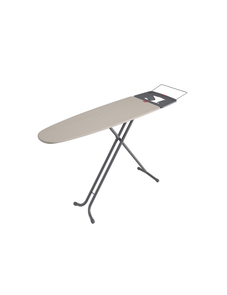 Tablero de metal expandido de 120,5 x 41 cm con malla metálica que permite una óptima circulación del vapor. Altura regulable en infinitas posiciones. Dispone de reposaplanchas regulable para centros de planchado. Con orificio para colgar la tabla y porta perchas.
