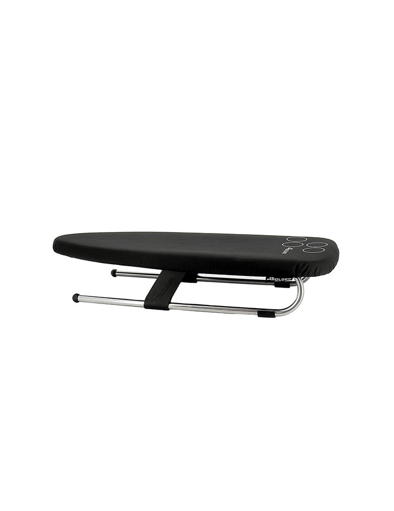 Tabla plegable de sobremesa. Gran voladizo delantero para para un fácil planchado incluso con sus dimensiones. Patas de fácil plegado, en aluminio, con puntos de apoyo de plástico antideslizantes para mejorar la tracción, evitar ruidos y posibles ralladuras en la superficie de apoyo.