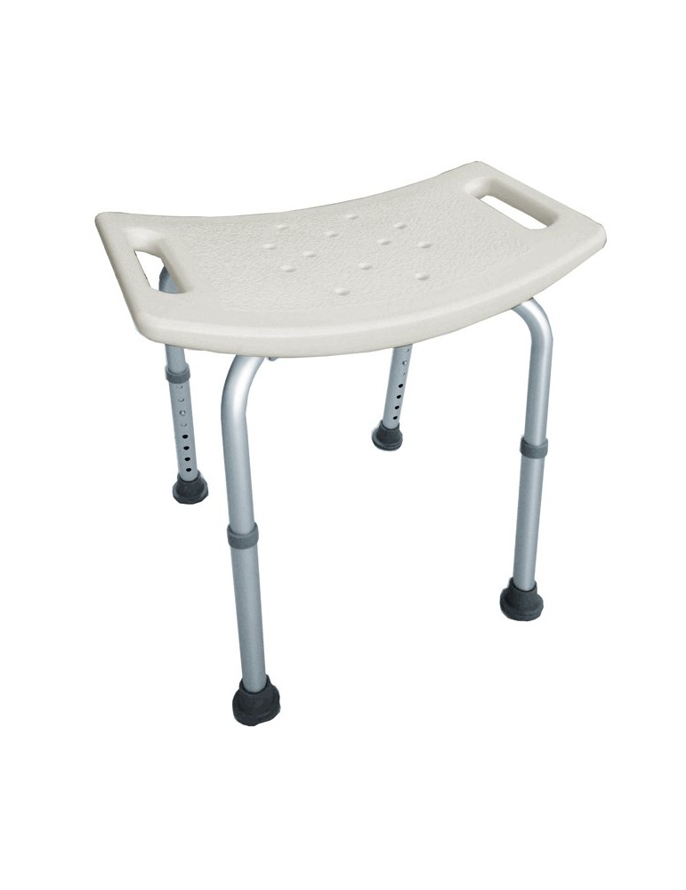 Asiento fabricado en material plástico con patas de aluminio y 8 puntos de anclaje que permiten un rango de altura variable de 35 a 55 cm y tapones de goma. Sirve para el interior y el exterior de la ducha.