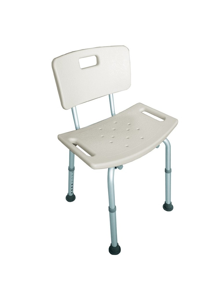 Asiento fabricado en material plástico con patas de aluminio y 8 puntos de anclaje que permiten un rango de altura variable de 35 a 55 cm y tapones de goma. Sirve para el interior y el exterior de la ducha. CON RESPALDO