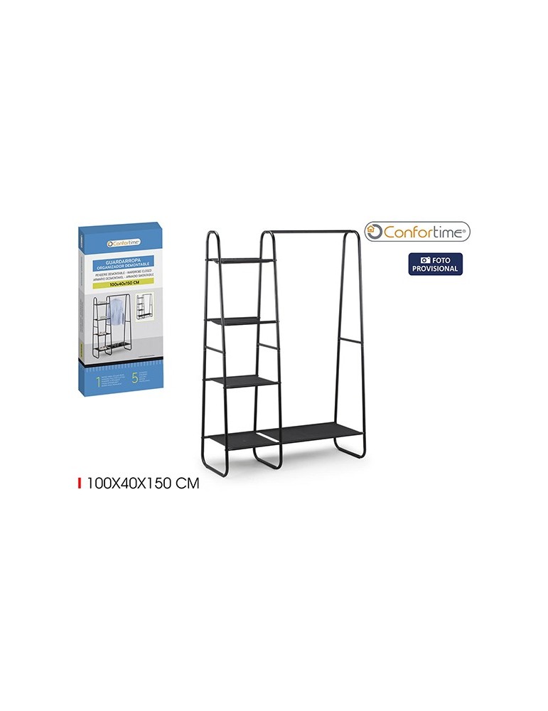 Desmontable, basado en estructura de tubo metálico, con una barra para colgar ropa y 5 estantes de tela de alta resistencia. Tamaño total: 100 x 40 x 150 cm.