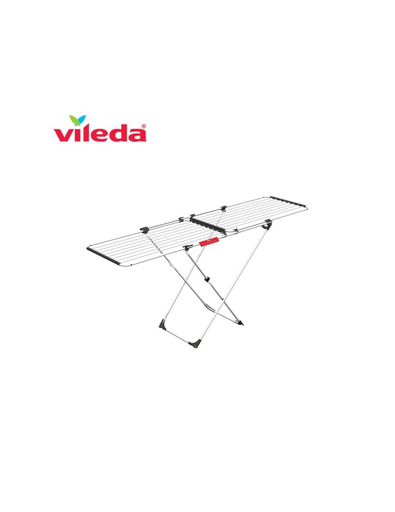 Con patas de acero y varillas gruesas de aluminio. Cuenta con dos rejillas superpuestas y corredizas que duplican el espacio de tendido. Incorpora ruedas, angulares antideslizantes, protectores antirayaduras.