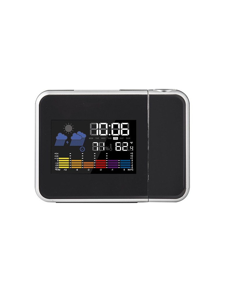 Pantalla LCD a color. Proyecta la hora en la pared y el techo. Indicador del tiempo: soleado, nublado, lluvia, etc. Indicador de temperatura y humedad interior. Indicador de día de la semana. Reloj despertador digital con alarma. Alarma sonora cada 5 minutos, modo snooze
